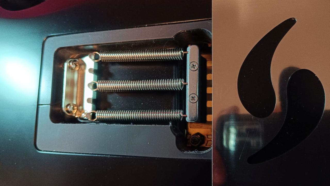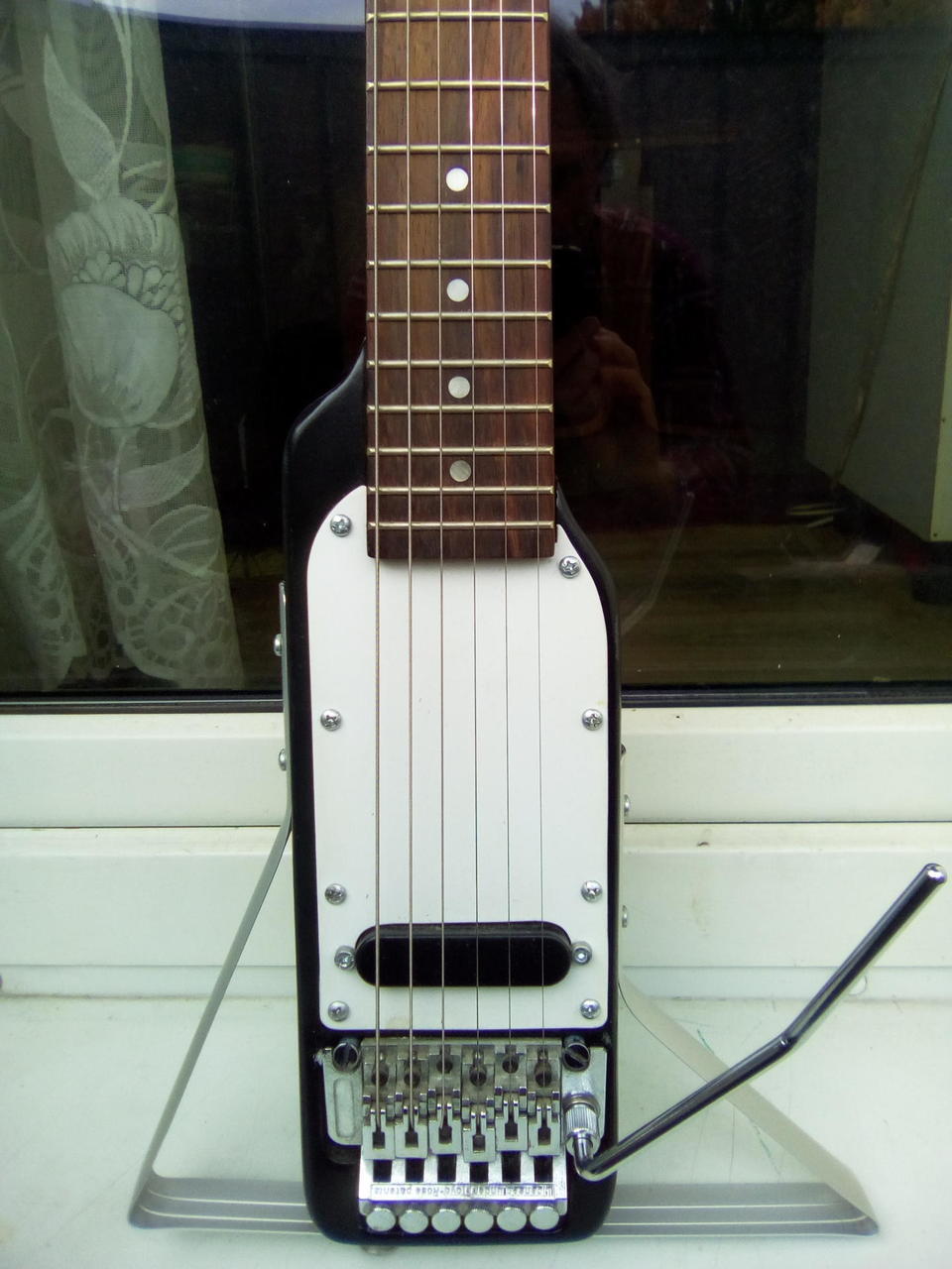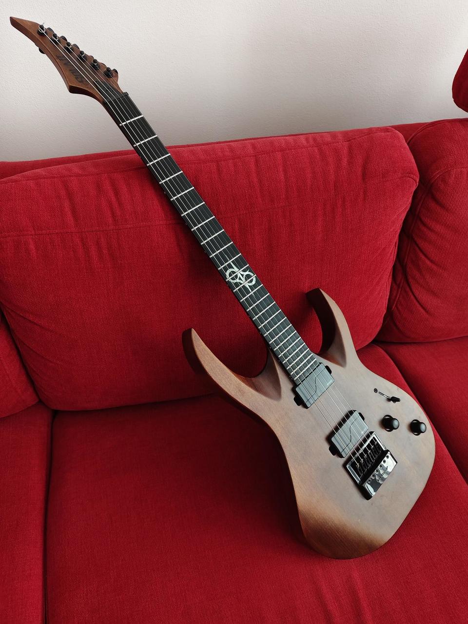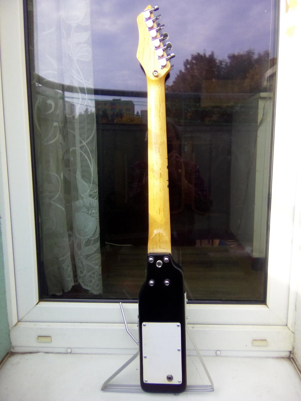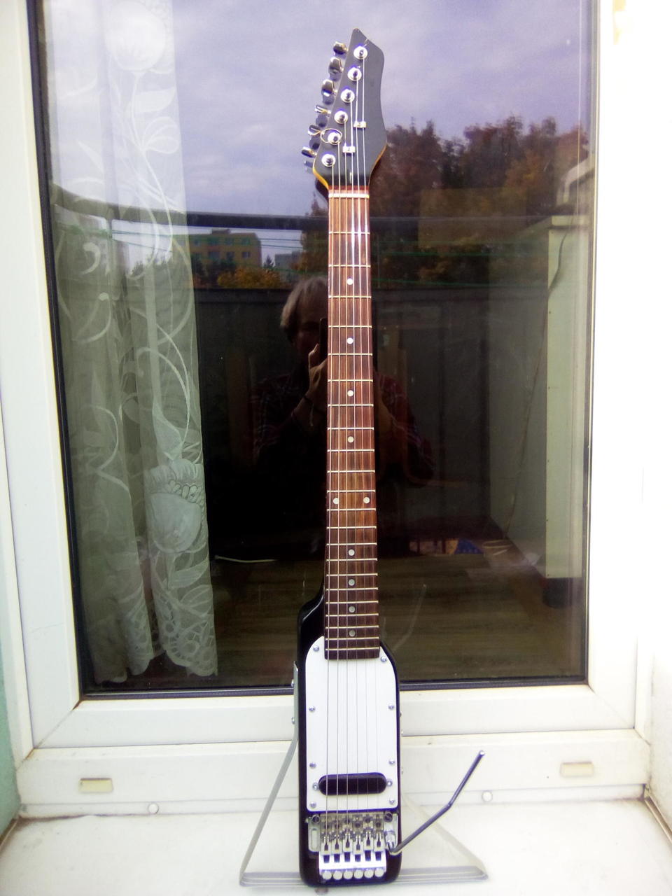Na zakázku zhotovená odlehčená kytara - hmotnost jen 2,5 kg, takže šetří záda. I přes malé tělo má výraznou rezonanci a sustain, za což může povedený krk a masivní licenční tremolo Floyd Rose. Nasucho hraje stejně hlasitě jako běžný Strat nebo Tele. Hliníkové lišty jsou připraveny k montáži nějakého bateriového minizesilovače - jak je to u kytary Bigbeat z šedesátých let - nebo jdou sundat a provozovat např. s bezdrátem. Komu by vadila absence potenciometru hlasitosti, může namontovat nějakou efektovou krabičku. Menzura krku je klasická jako u Stratocasteru, čili nezmenšená. Preferuji osobní odběr v Brně - kdo přijede, tomu ještě seřídím kytaru... :-)