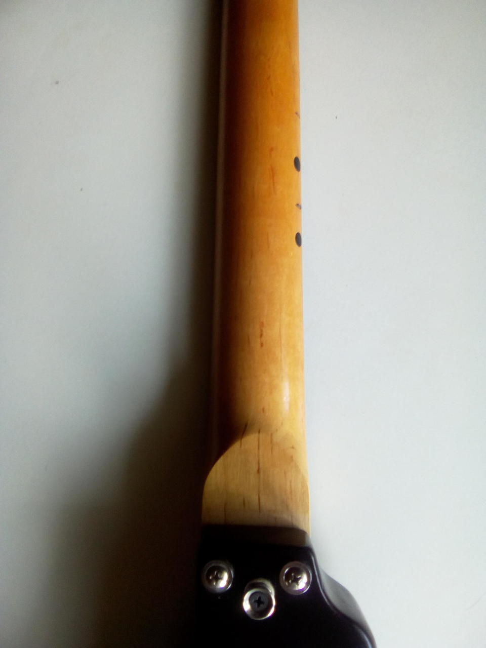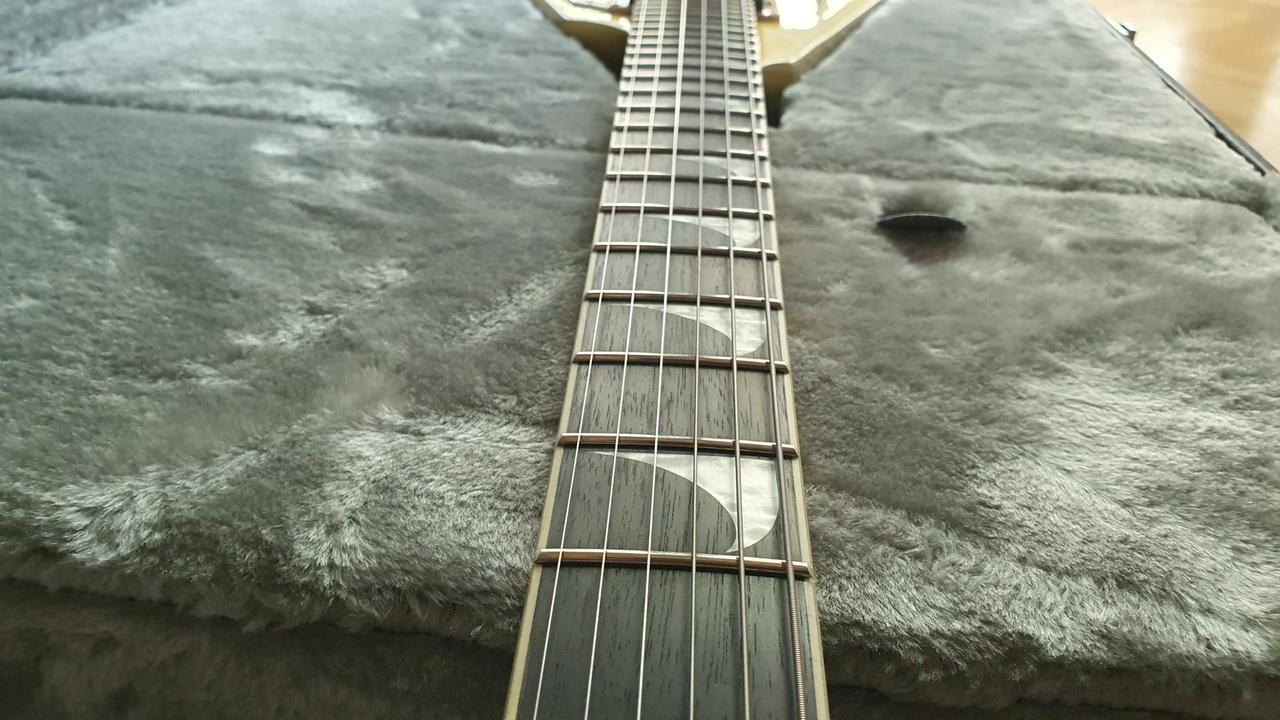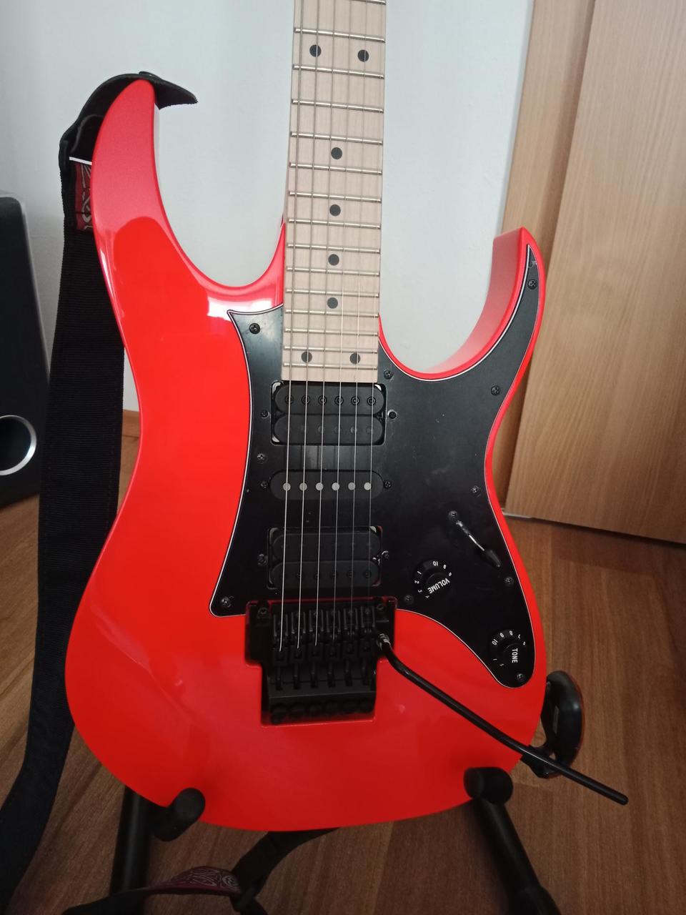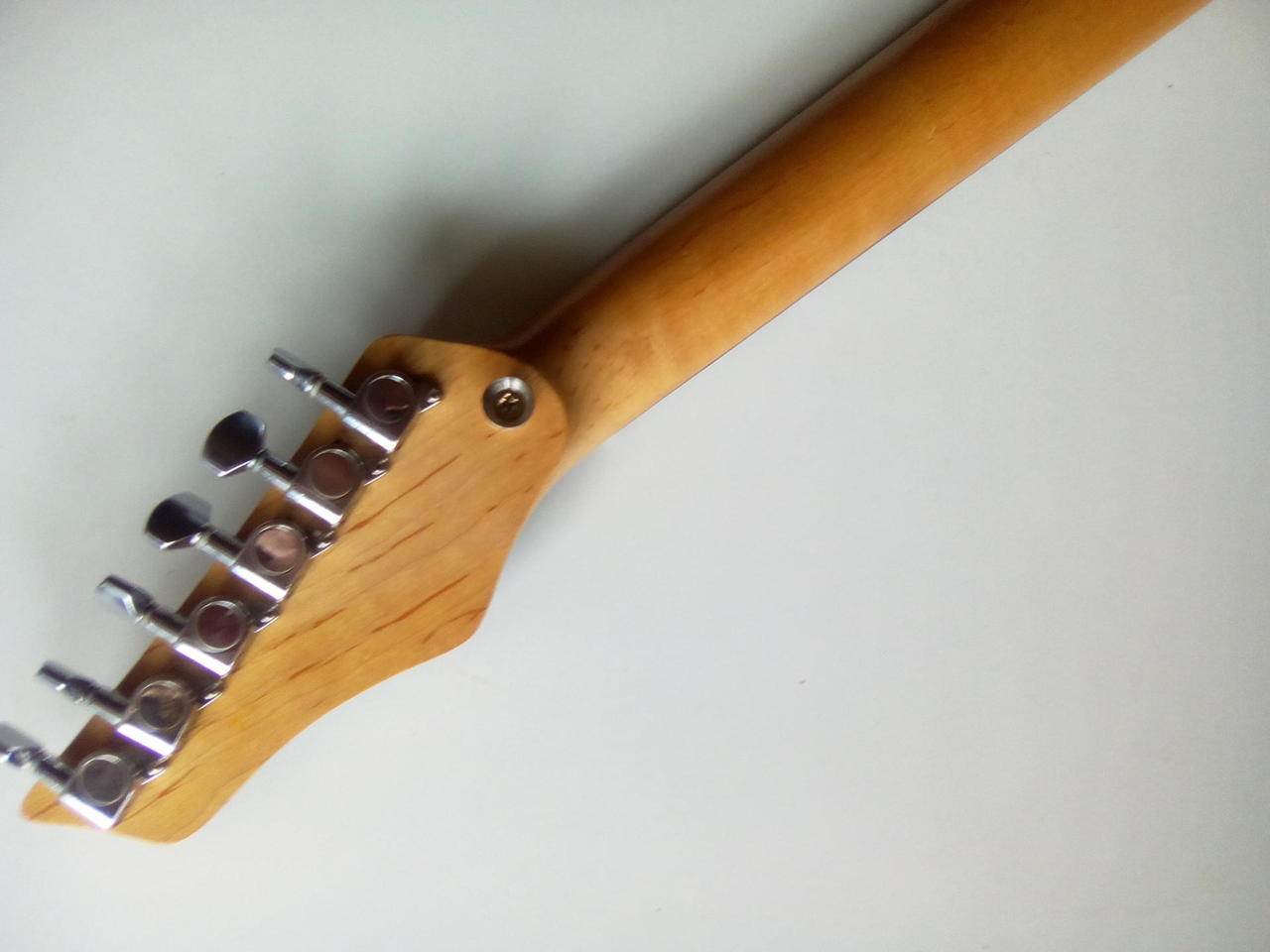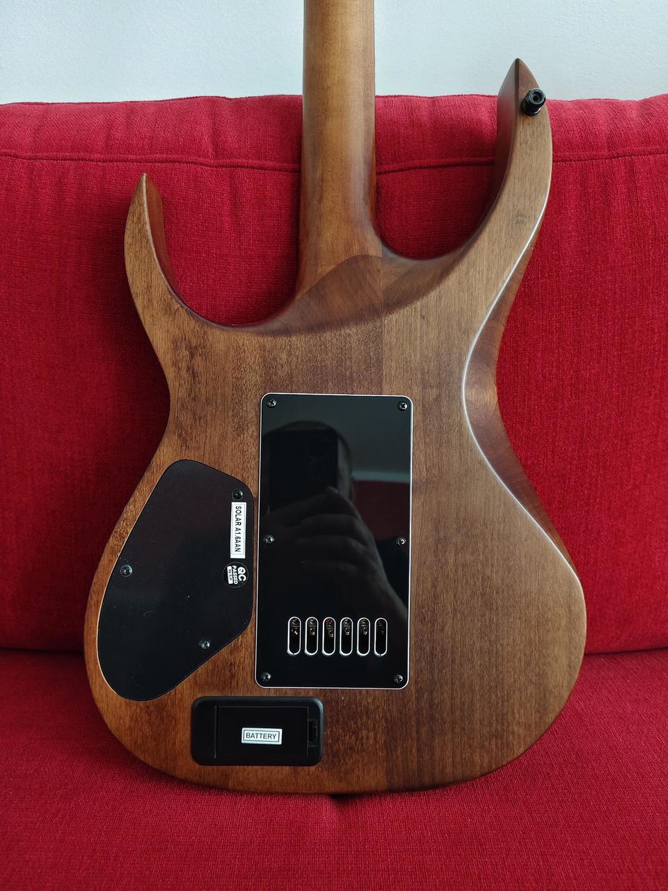 Na zakázku zhotovená odlehčená kytara - hmotnost jen 2,5 kg, takže šetří záda. I přes malé tělo má výraznou rezonanci a sustain, za což může povedený krk a masivní licenční tremolo Floyd Rose. Nasucho hraje stejně hlasitě jako běžný Strat nebo Tele. Hliníkové lišty jsou připraveny k montáži nějakého bateriového minizesilovače - jak je to u kytary Bigbeat z šedesátých let - nebo jdou sundat a provozovat např. s bezdrátem. Komu by vadila absence potenciometru hlasitosti, může namontovat nějakou efektovou krabičku. Menzura krku je klasická jako u Stratocasteru, čili nezmenšená. Preferuji osobní odběr v Brně - kdo přijede, tomu ještě seřídím kytaru... :-)