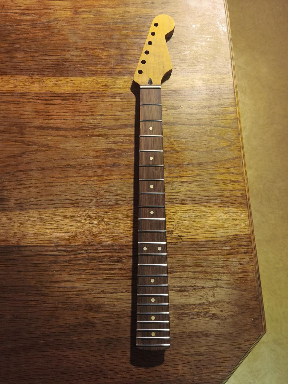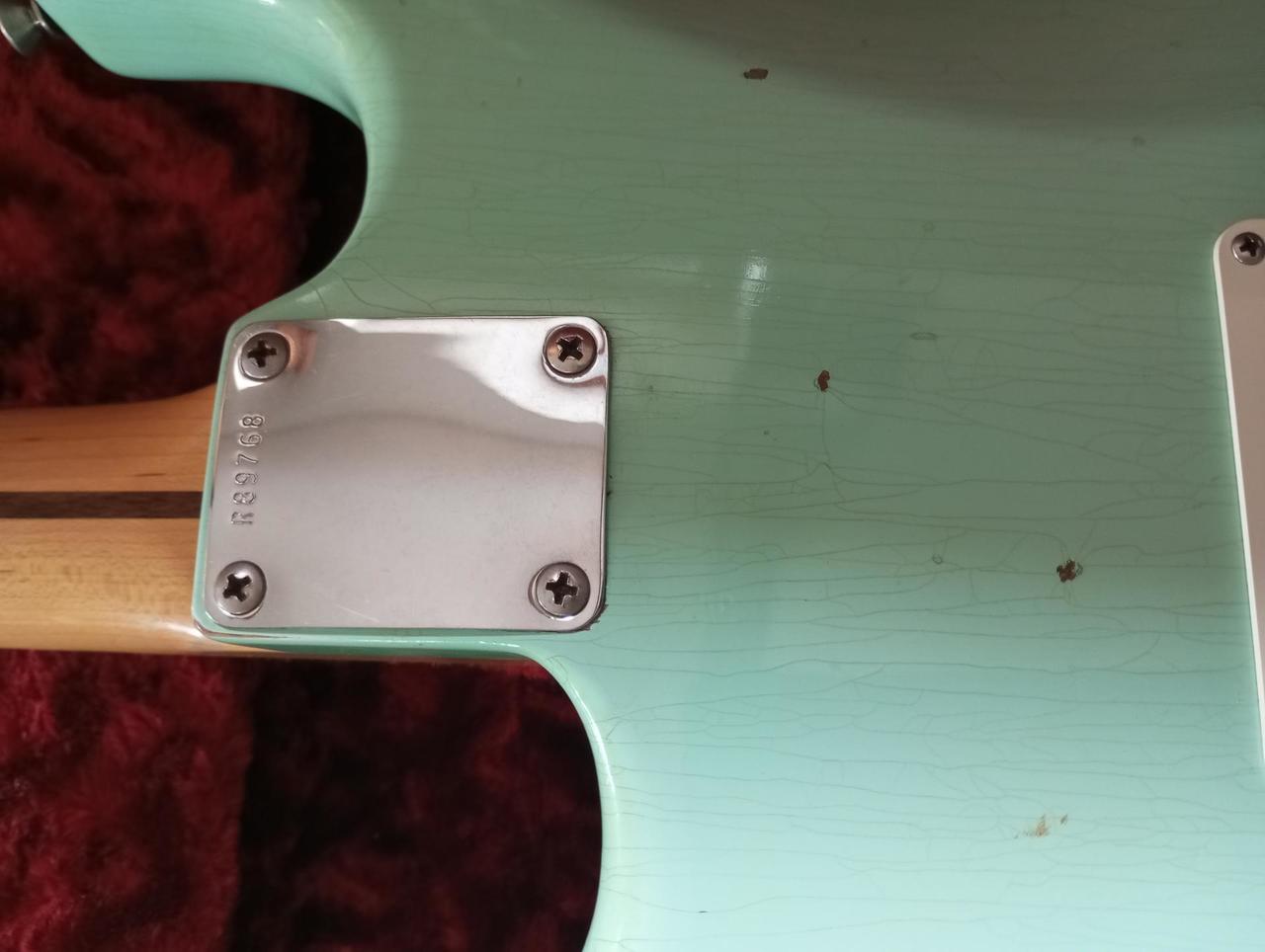 Krk: Allparts Fat Tele Neck 9,5" rádius jeden kus javoru, ladící mechaniky Kluson style, které mají zevnitř napsáno Made in Japan, nultý pražec neměl rovnoměrné rozteče strun, proto Honza Vlasák (Vivian Instruments) instaloval nový nultý pražec ze zvířecí kosti. Struny 10-46 Elixir. Pražce jsou ve velmi dobrém stavu.
