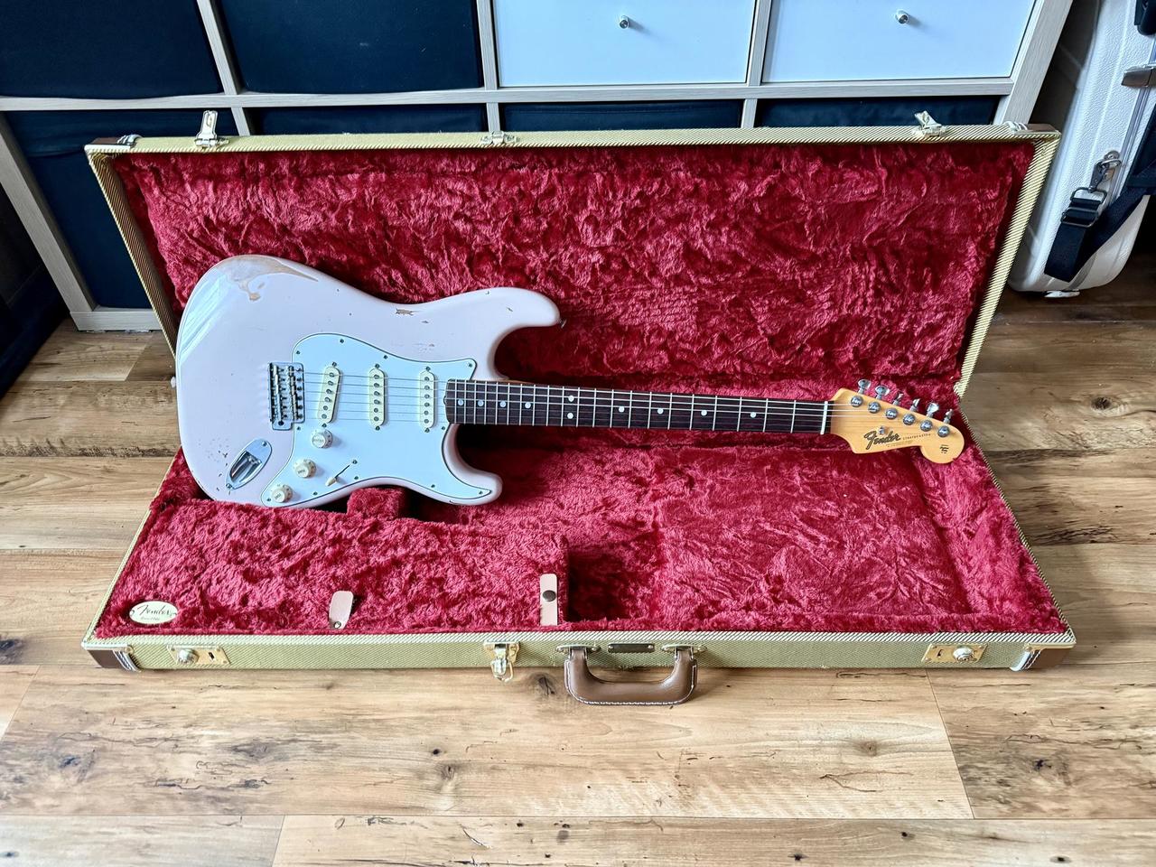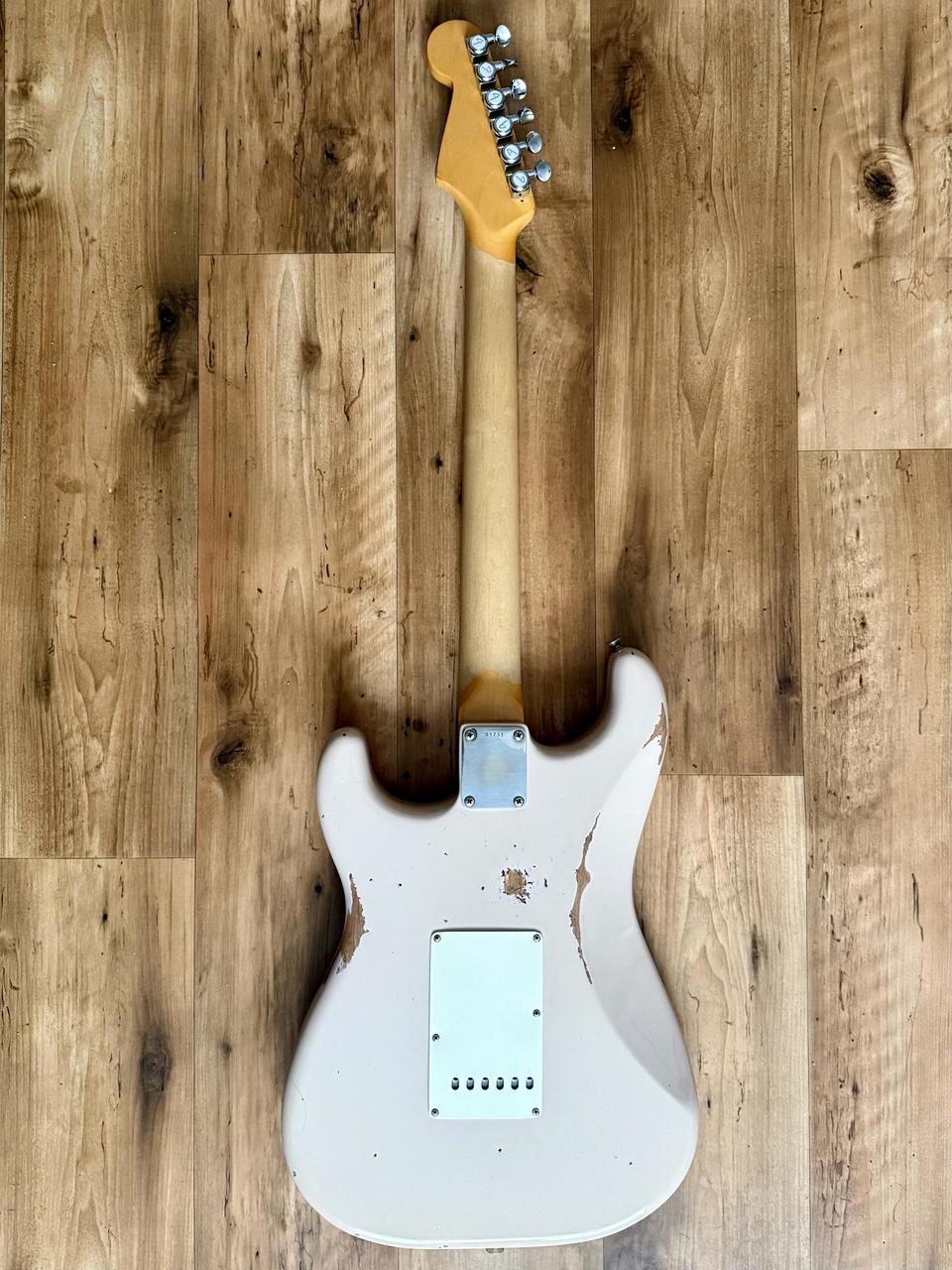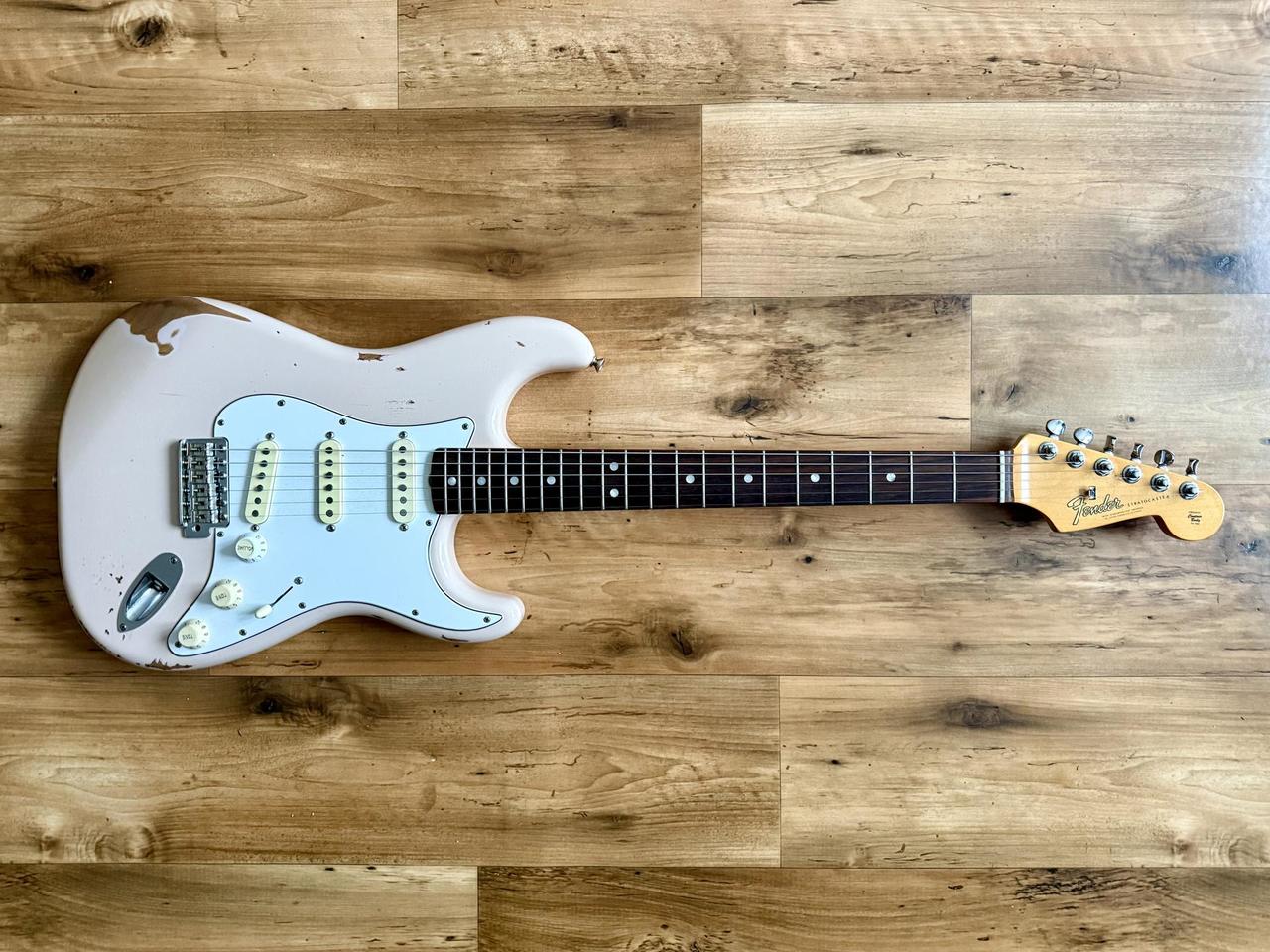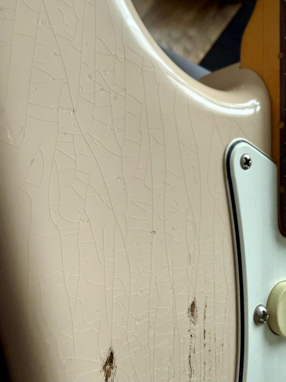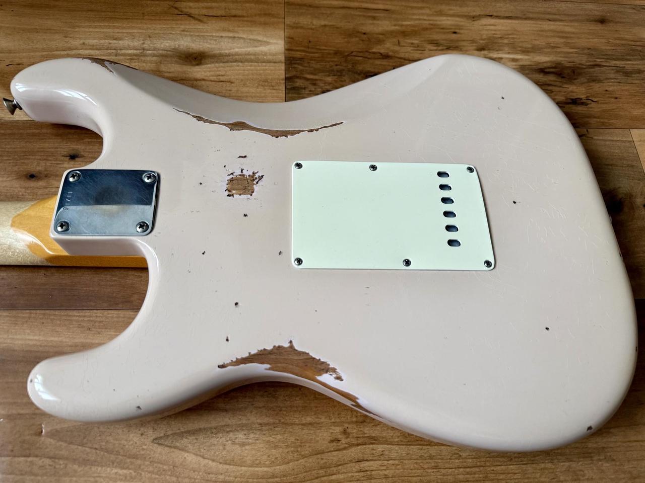 Tělo: Fender FSR (limitovaná edice) Road Worn 60s strat tělo z olšového dřeva s nitrolakem ve vybledlé růžové (Shell Pink), lak jsem nechal profesionálně rozleštit. Jsou na něm patrné různé ťukance a typické praskliny, které se vyskytují na řadách Custom shopu.
